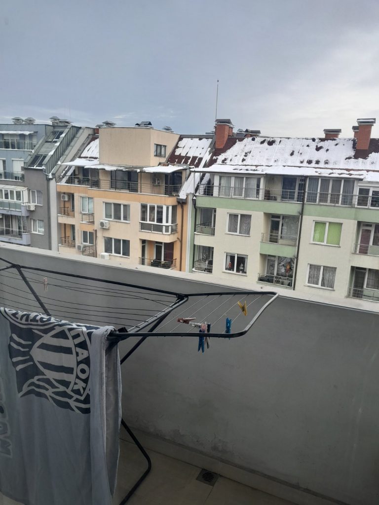Апартаментът е ситуиран на 5-ти жилищен етаж в сграда с тухлено строителство.